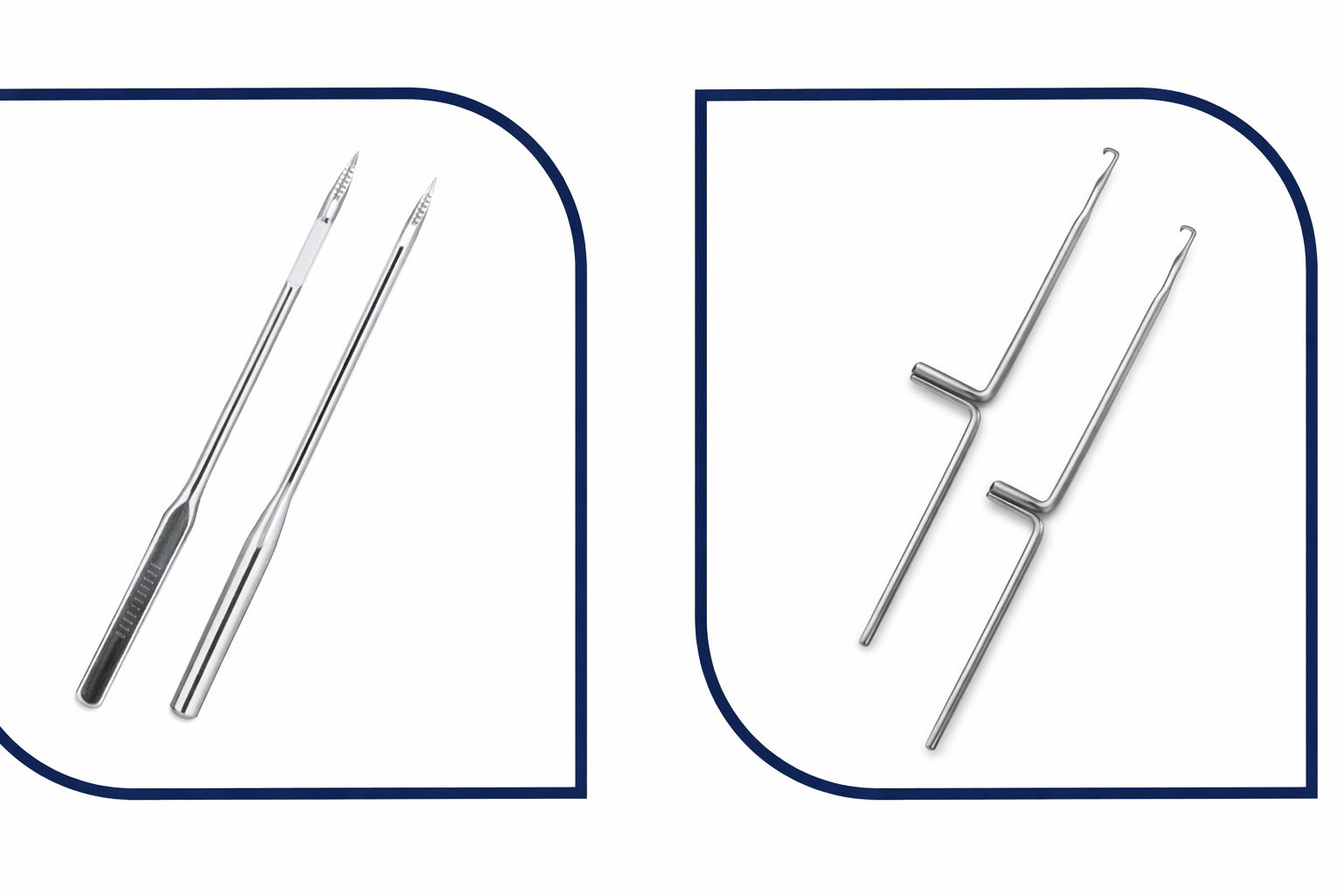 After the tulle piercing is complete, thread is threaded through the hole in the needle’s tip.